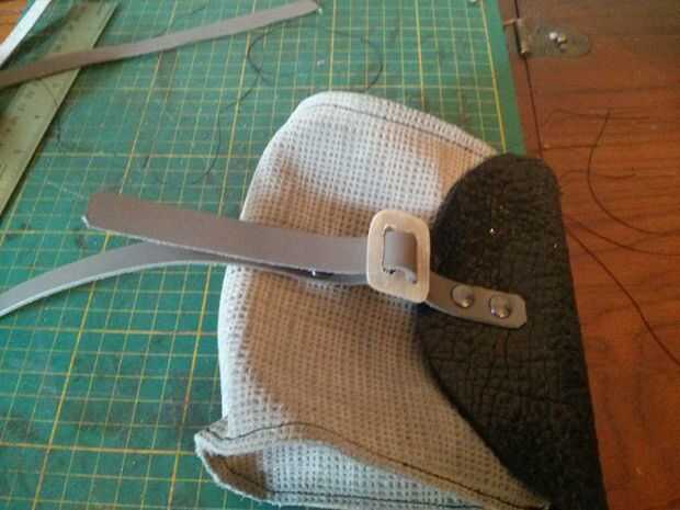 Por último, una correa se une a la tapa de la bolsa. Te recomiendo un doble remache para evitar que la correa de desplazamiento alrededor y finalmente trabajando suelto.