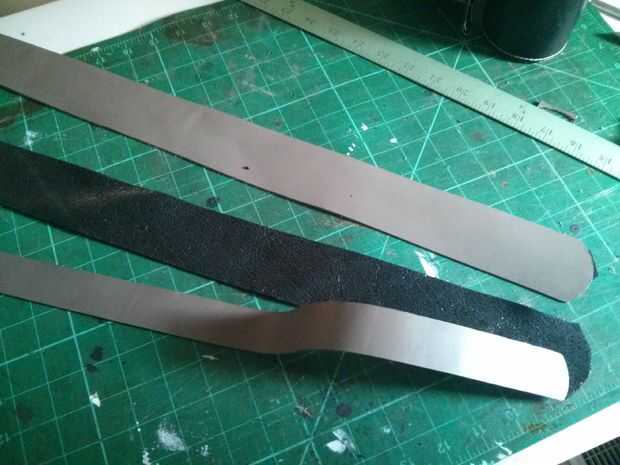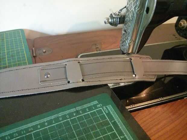La correa de hombro se crea utilizando un 2 "x 24" pedazo de 3-4oz veg tan cuero con un mismo trozo de 7-9oz cromo curtido cuero pegada y cosida a él para actuar como acolchado de la correa. Hay una menor 1,125 "x 18" correa para el extremo de la hebilla que se teje a través de perforado y corte las ranuras de la correa principal.