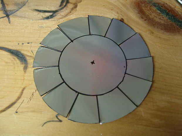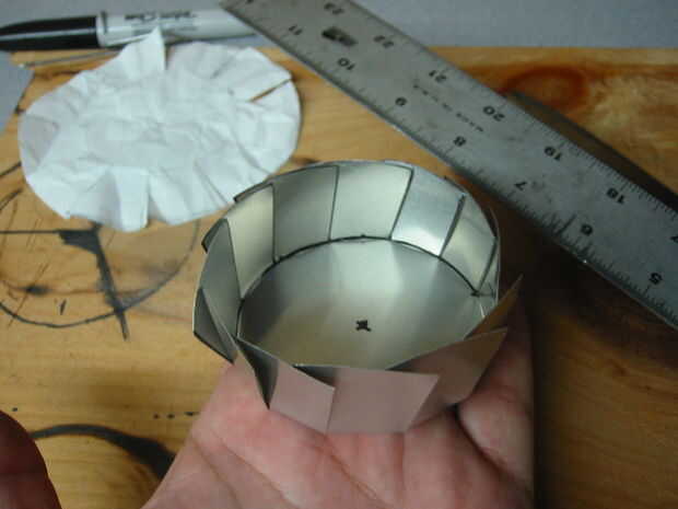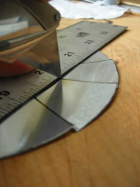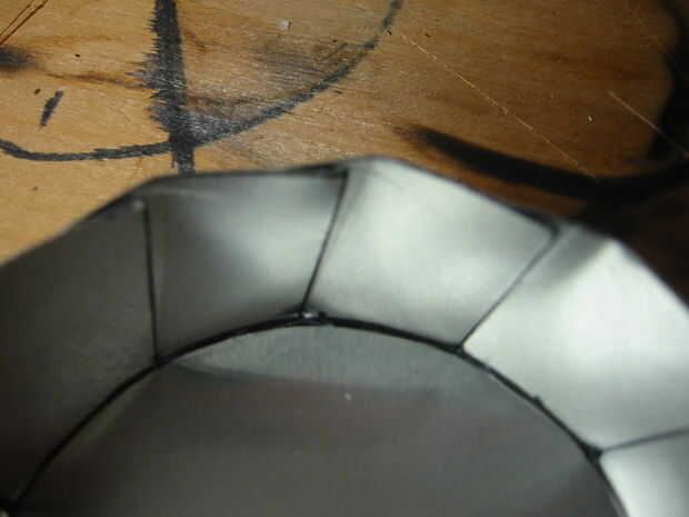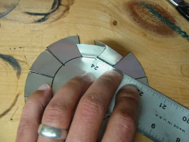 A continuación, tome la regla y la puntuación (sólo anotar... no cortar a través de todo el camino. Sólo usted está buscando para dar el metal una idea acerca de donde usted quiere doblar, aquí) a lo largo del círculo interior. Ir desde la intersección de una línea a la siguiente, en una línea recta. Lo terminarás aquí es un dodecágono (12 lados poliedro) cuando hayas terminado plegable.