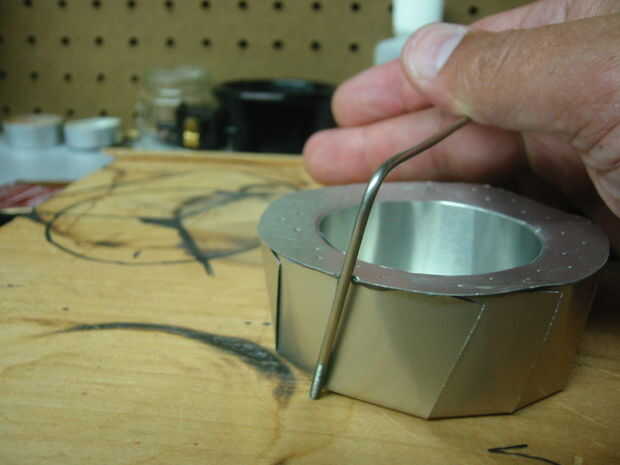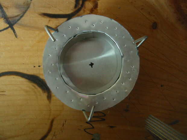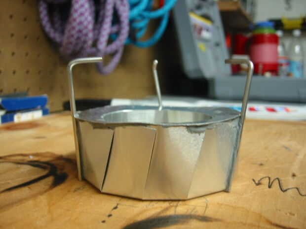 Ahora, escoja tres ranuras para su trébede subir a través de. Quiero cortar unas pequeñas muescas en la parte superior para lavar mi resto de radios. Elimina la necesidad de llenar el vacío con JB Weld, que agrega a la integridad estructural de los soportes de olla.
