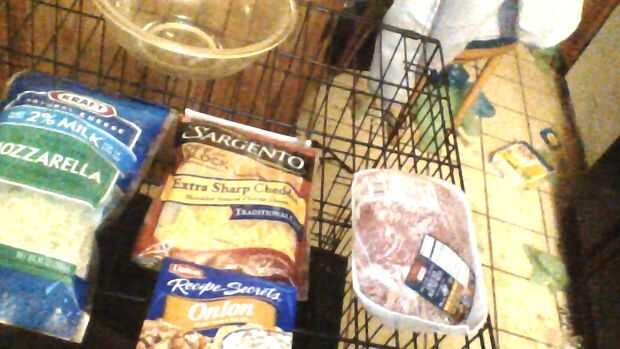 Kraft rallado queso Mozzarella, queso cheddar Kraft rallado, mezcla de cebolla Lipton y una libra de carne de res. * Opcional * sartén, espátula, parrilla.