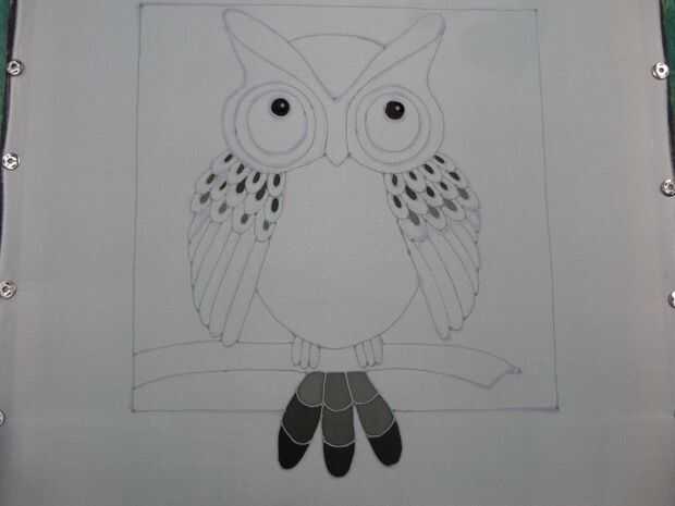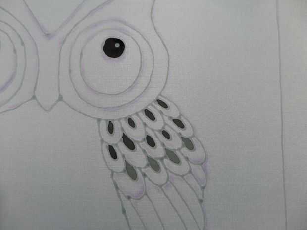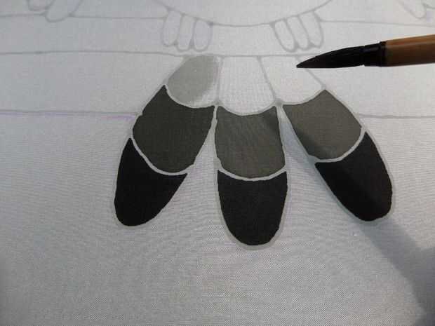 Comencé a pintar este búho en la cola, utilizando el negro en el extremo de la cola, del concentrado diluido el negro para hacer el gris medio en la zona media y finalmente diluir esta sombra a hacer la más ligera sombra gris.