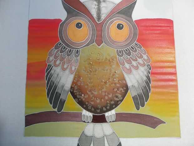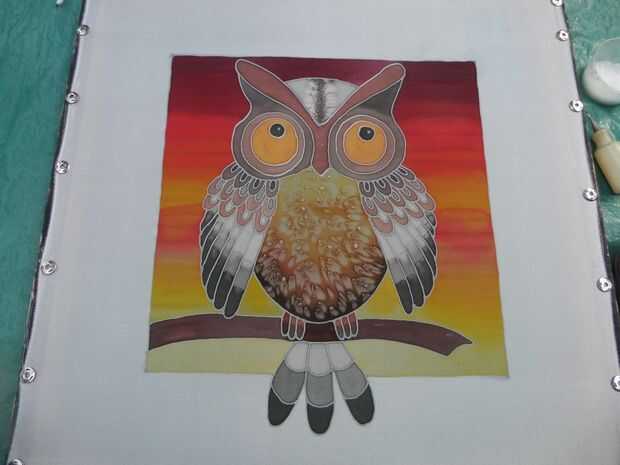 El efecto de la sal está desarrollando muy bien aquí, probablemente unos 10 minutos desde colocó en la pintura. El registro y otras partes de la cara de los buhos eran mezclas marrón/negro y ciruelas, que dan una sombra marrón reddy.