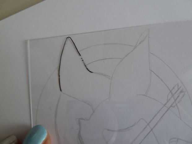 Colocar el plástico sobre el dibujo o imagen que hizo/imprimió y trazar con la tinta. No necesita trazar todas las líneas, sólo los contornos que usted necesita para cortar.