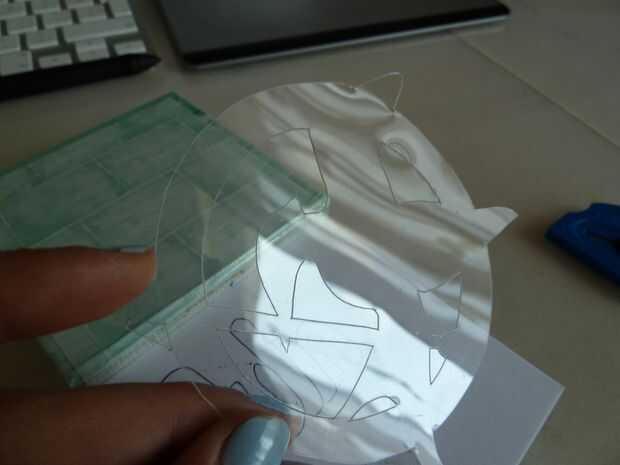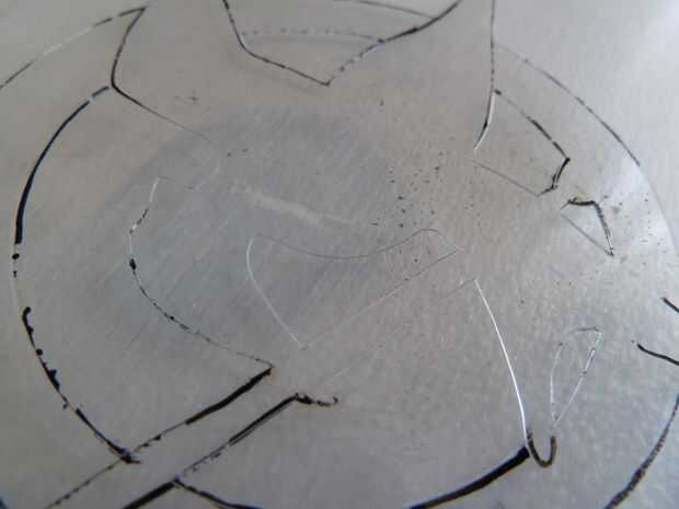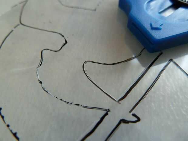 Marcar las líneas internas del dibujo utilizando un cuchillo del exacto. No necesita cortar completamente a través todavía. Una vez que se trazan todas las líneas, simplemente tome un paño húmedo y limpie la tinta.