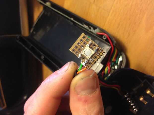 Localice el botón y quitar la tarjeta PCB de su lugar. Usted podría ser capaz de usar el PCB original para el botón pero hice uno por mi cuenta. Cuando haya terminado de soldar los cables que tenía que hacer el PCB más delgado para poder colocarlo en el lugar original y nuevo botón de dos etapas. Una navaja era fácil de utilizar cuando se intenta dividir el tablero.