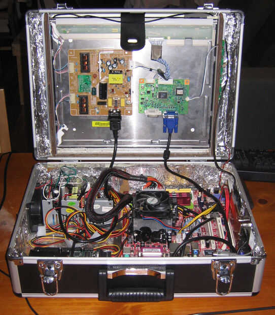 Ya tenía todos los componentes de pelado abajo y (excepto el monitor) montado en placa de aluminio, así que la mayoría del trabajo fue simplemente disponerlos adecuadamente en el caso y uniéndolas con una gran cantidad de remaches y cinta de pegar un poco. Esto fue un poco complicado, ya que la tarjeta inalámbrica tiene que esquivar el soporte para el monitor cuando el caso está cerrado.