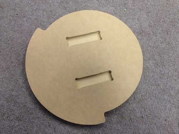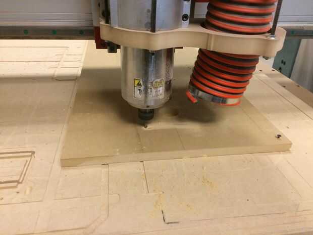 Corté el MDF 18x49in trozos así que era más fácil de llevar. El MDF se atornilla en la mesa de fresadora CNC y Mach3 fue utilizado para cortar las partes del separador. Los soportes pueden recortar con una sierra de mesa y la parte superior e inferior pueden cortarse utilizando un router con una plantilla de círculo.
