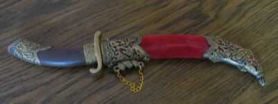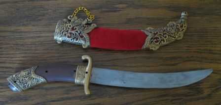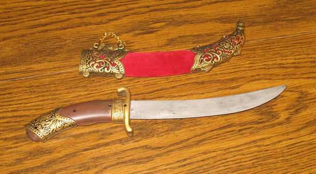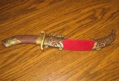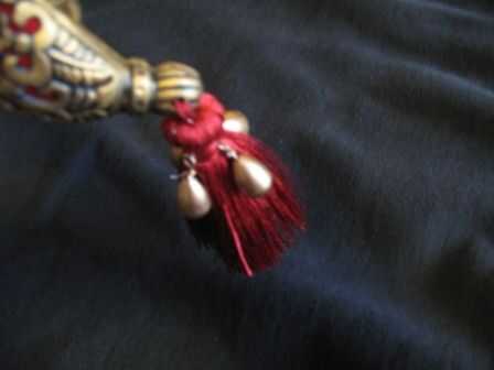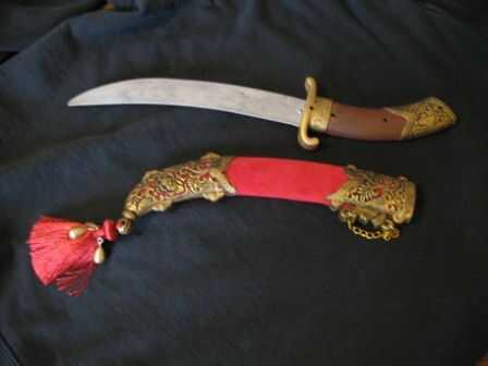 25. Si usted planea usar el machete, usted necesitará completar un paso final. Usted debe peso demasiado la funda de, o tu daga/Sable/Espada caerá justo cuando encadenan a su cinturón, la empuñadura es más pesado que cualquiera de las partes constituyente. Para ello, tienes que ser creativo. He comprado cinco pesos de pesca en dos tamaños. Después de oro de la pintura de aerosol, cosió el más grande y pesado en una tienda borla escarlata. He utilizado cuatro pesos más pequeños en el exterior de la tasse. Sin duda, parece una borla con pesos de oro de la pesca ahora, pero ¿qué quieres? Es una espada de plástico! Como sucedió, mi espada tenía un misterioso agujero perforado en el extremo de bola decorativa de la vaina, así que pescó mi borla inteligentemente ponderado a través de él y había cosido firmemente con un hilo y aguja. Ahora contrapesa la empuñadura ponderada muy bien y luce maravillosamente amenazando cómodamente colgándose de mi cinturón.