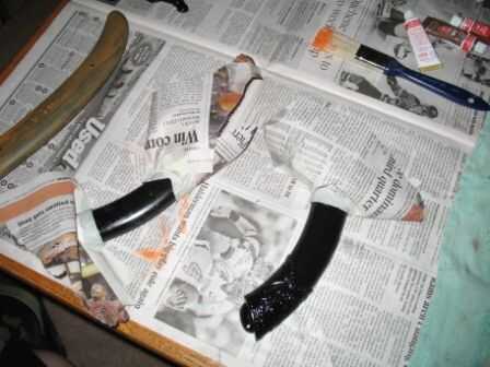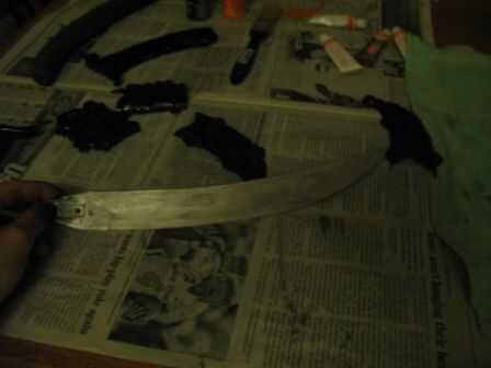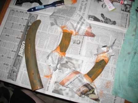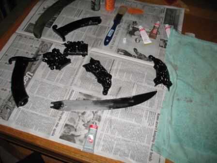 6. comenzar a enmascarar cualquier filigrana. Ahora vamos a empezar nuestro revestimiento de madera en la vaina y la empuñadura. La cinta de las partes que serán metálicas, si cualquier. Para esta obra, tuve que ambos extremos de las piezas de la empuñadura, la cinta revela una sección en el medio para ser falso pintado. Enmascare el final entero que intenta conservar, como la pintura de aerosol se aplicará en un último paso y se mancha su superficie 'metálica' si no está cubierto.