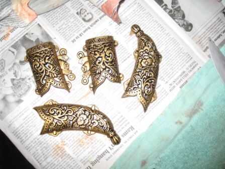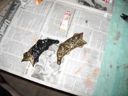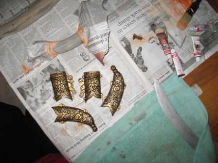 10. ahora es el momento de añadir el acrílico ladrillo rojo en la parte superior el beige utilizando la misma técnica de pincel seco rayado. Deje que se seque. Ahora, y puede tomar con los dedos y unas cuantas rayas de acrílico negro, o, como hice, unas rayas de 'cobre español' Rub n' Buff. A continuación, volver atrás y hacerlo todo de nuevo. Primero naranja, luego beige y ladrillo rojo. Después de color sólido dos progresiones se han secado, es tiempo otra vez hacia fuera con la pintura en aerosol.