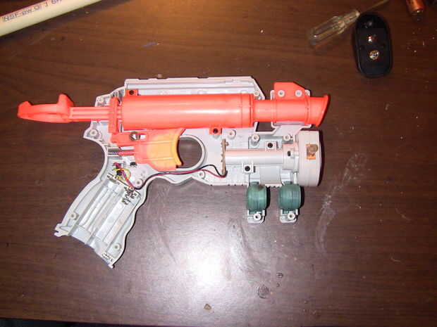 este es mi nerf nite finder han quitado los restrictores de aire y tienen streched afuera en la primavera tal vez dispara doble lo que hizo. bien así que aquí está el registro de im razón necesito ayuda tratando de convertir esto en un rifle para la