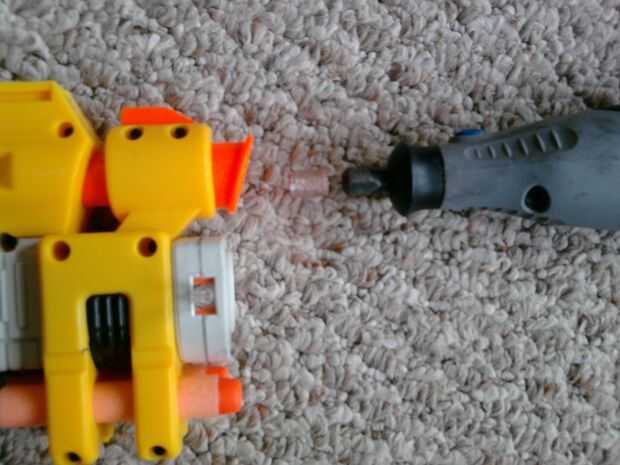 utilicé la herramienta dremel a la arena justo abajo de la barra en el cañón así que encajaría en el dardo.