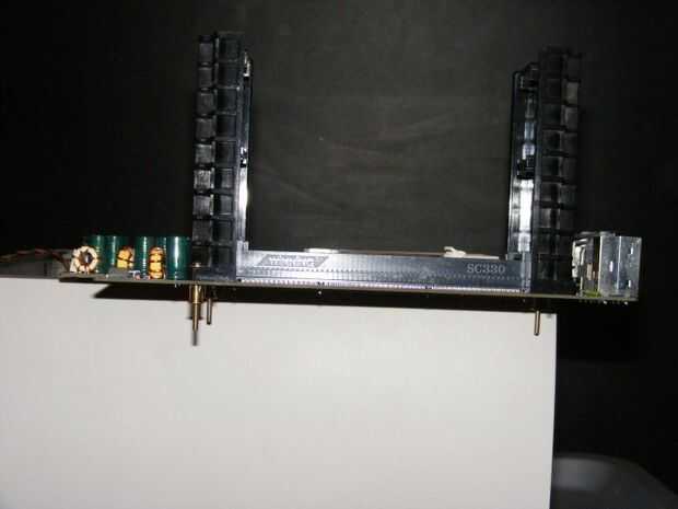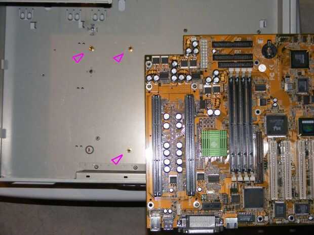 Poner los tornillos a través de lo que soportes, luego a través de la placa base (segunda imagen). Atornille parcialmente los separadores en los extremos de los tornillos, así que los tornillos todavía tienen espacio para moverse de un lado a otro todavía. Dejar lo suficiente de la punta del tornillo pase a través de los orificios en el caso. Luego, ponga la parte posterior de la Junta en la parte posterior de la caja. A partir de ahí, baje con cuidado el frente de la Junta mientras que asegurándose de que los extremos de tornillo pasen a través de los agujeros (tercera imagen). Usé el archivo redondo para guiar los extremos en los agujeros. Si los separadores son roscados para los tornillos, los tornillos en el resto del camino.
