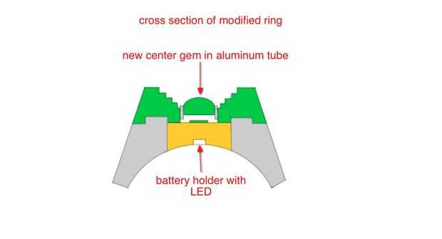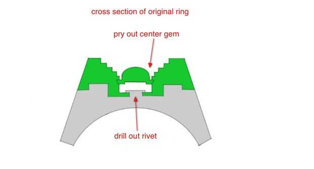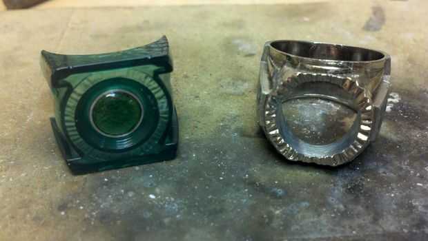 Hizo una nueva joya de centro cortando un trozo de chatarra acrílico verde transparente y luego lo formó y había pulido con una Dremel y luego lo ajustaron en una pequeña sección de 3/8" de diámetro tubo de aluminio que era cortar con el Dremel con una rueda de corte. Talladas a la parte posterior de la joya acrílica con una fresa de bola pequeña para darle un cristal más como efecto. El tubo de aluminio/gem se ajustaron luego en la parte superior del anillo.