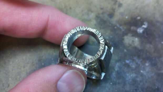 Ahora notarás una zona empotrada en la pieza inferior del anillo que es de aproximadamente 14mm de diámetro. Esto tendrá que aburrirse a todo lo largo en la parte inferior del anillo. Tenga cuidado de no quitar demasiado material-sólo desea aumentar la profundidad del agujero, no aumentar su diámetro.