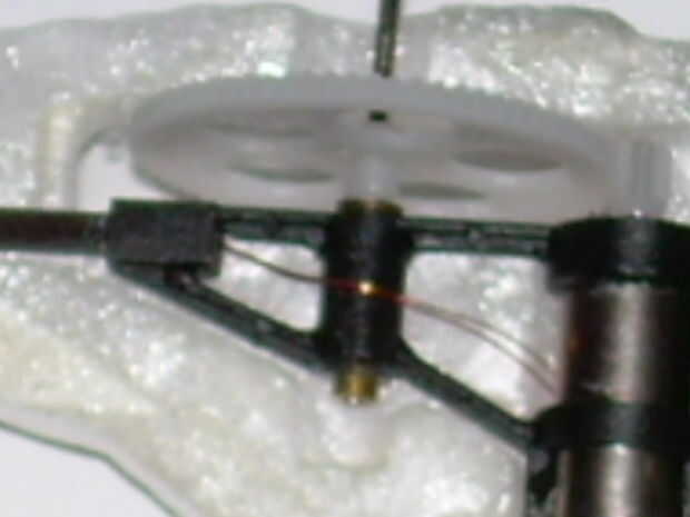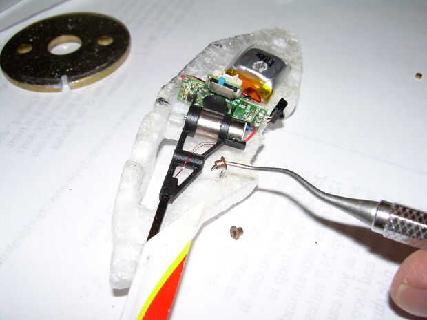 Una vez que se quita el rotor principal, el engranaje y el eje pueden eliminarse quitando el collar pequeño de latón en la parte inferior del eje. Después de que el eje ha sido tirado hacia fuera quitar el latón con dos cojinetes en ambos extremos del montaje del eje de rotor (mostrado abajo se quita con la selección dental). Luego empuje el gran engranaje en el eje de acero. Guardar las arandelas planas (2); uno es en la parte superior entre el engranaje y del cojinete de cobre amarillo y la otra es en la parte inferior, entre el collarín de latón y el cojinete de latón. Lo vuelva a instalar a las arandelas planas en las mismas posiciones durante el montaje, pero los casquillos pueden ser desechados como se reemplazará con los rodamientos de bolas.