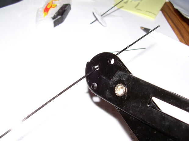he usado un par de Diagonales Pelacable para cortar la varilla de fibra de carbono, reduce las posibilidades de separación de los extremos. Simplemente corte a la longitud del mismo (1-9/16") como el eje de acero original. Una vez que el árbol es cortado, instalar el engranaje en la misma posición que tenía en el eje de acero (aproximadamente 1/2" del extremo inferior del eje). Utilice un poco de pegamento CA para mantener en posición. Que tenga para "construir" el eje ligeramente con un poco de la cola de CA antes de instalar el equipo. Pongo una capa delgada de pegamento sobre el eje, donde el engranaje se colocaría, permite que se seque y luego presiona el engranaje en el eje.