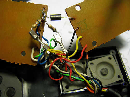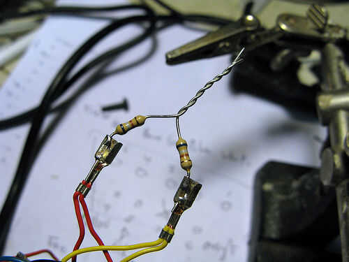 Como en la imagen... Conecte un extremo de cada una de las dos resistencias que retiramos de la placa de circuito de Atari, los otros extremos se consigue soldados a los conectores rojo y amarillo que no clip off. Una vez terminado poner a un lado hasta que conectamos el diodo a las juntas.