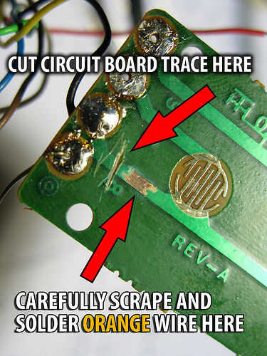 También con el mismo cuchillo, con cuidado raspa a través de la máscara de la soldadura para exponer la placa de circuito de cobre fresca. Ahora soldadura la naranja cable a la placa de circuito para el lugar expuesto en el rastro le a creado como como en la imagen.