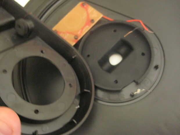 Hay lo que parece un cable audio a través de la pieza de plástico desenroscarse antes. Corte el alambre hasta que una ponga el corte circuito azul y a un lado del alambre. Debe tener la parte posterior del platillo (donde fueron los tornillos) vacía!