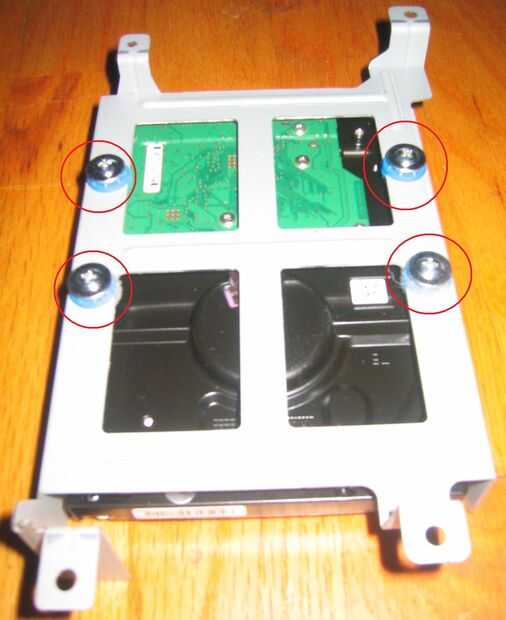 A continuación Quite los 4 tornillos de montaje del soporte de montaje de disco duro. Ellos están en un círculo en rojo en la segunda foto.