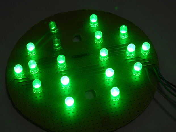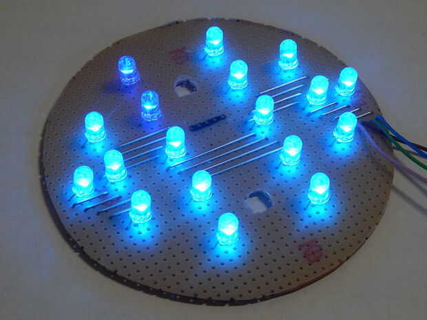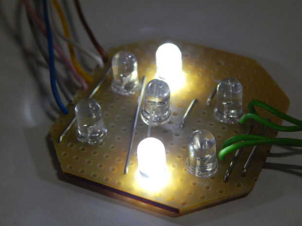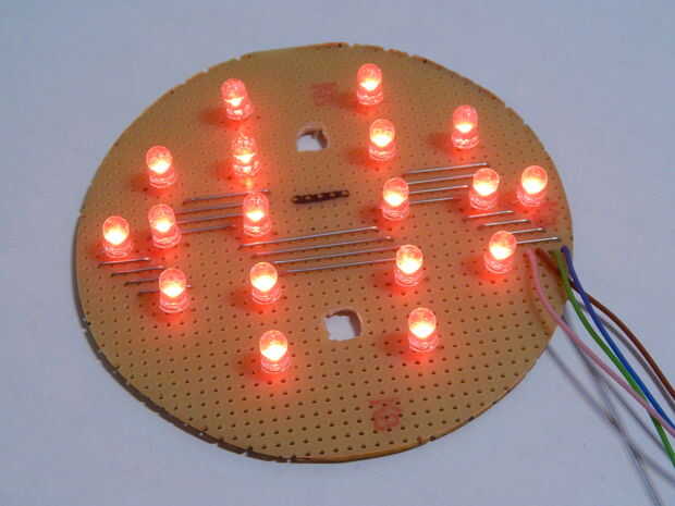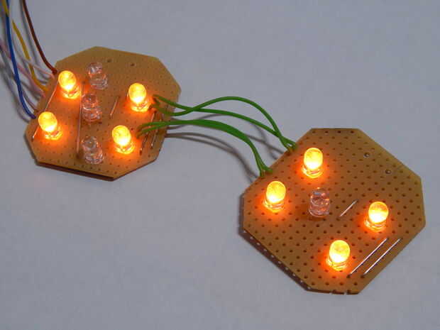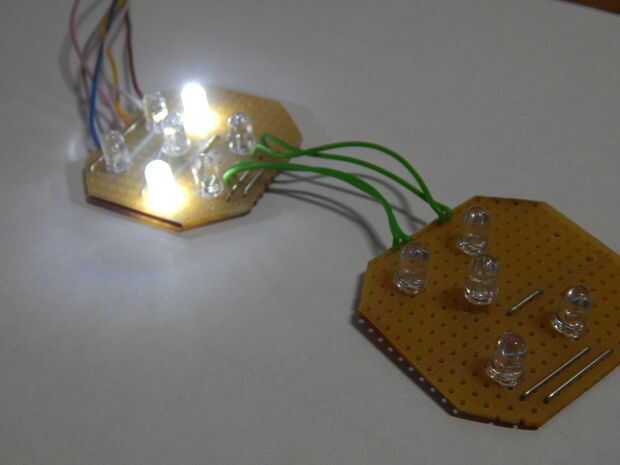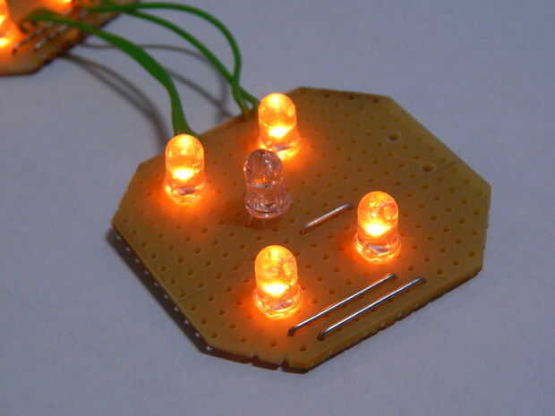 Utilizamos veroboards con rastros de cobre pelados para los intermitentes y luz de freno, porque es más fácil unir en paralelo de esta manera. Utilizamos una dremel y raspadores para darles un tamaño personalizado. De esta manera se encajan perfectamente en sus casos más adelante. Puede decidir cuántos LEDs que quieras en cada señal de la vuelta y luz de freno. Elegimos esta constelación:
