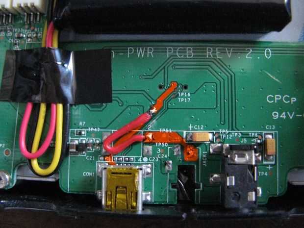 Hay un pad de soldadura grande que se puede utilizar para el lado de carga CC, pero para la pista USB tienes que raspar de la capa de aislamiento verde de la pista para exponer el cobre debajo para soldar el alambre al.