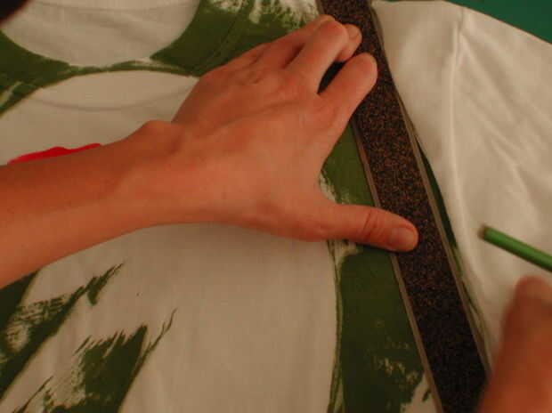 me gusta hacer la manga sólo cortar y darle la vuelta y alinear en la parte superior de la manga, sin cortar, emparejar los bordes lo mejor que pueda. Luego, utilice un borde recto y transferencia de la línea de corte con un lápiz. Cortar la otra manga a lo largo de esta línea, así los ángulos coincidan con la medida de lo posible.