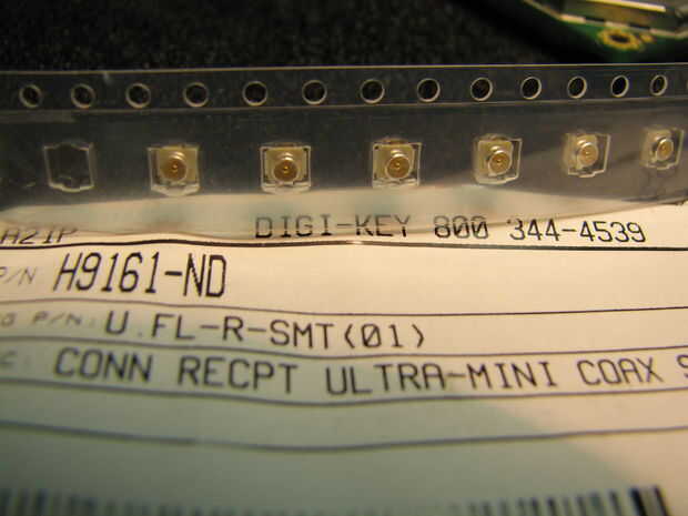 Algunos conectores U.FL estaría bien, obviamente. Yo tengo la mía de Digi-Key, donde están $1,39 a partir de esta escritura. También se pueden compactarlos de muerto tarjetas wireless Mini-PCI, si tienes cualquier sentada alrededor, pero quitarlas intacta es difícil.