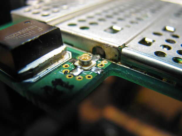 Repita el proceso para el otro cojín de tierra, luego de la almohadilla de la señal. La almohadilla de tierra más posterior, que fue utilizada para el conector H.FL, no deben usarse para el conector U.FL pero soldado de todas maneras.