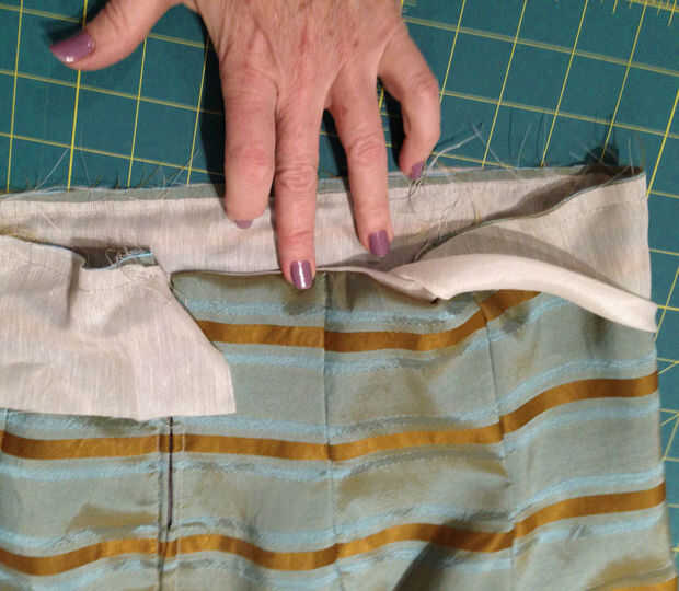 - Acabado de la parte superior de la falda. Coser una franja ancho de tres pulgadas de tela para el lado derecho de la cintura con un margen de costura de 1" a su vez la tira sobre el interior de la falda y el hierro. Parte superior coser la parte superior de la falda.