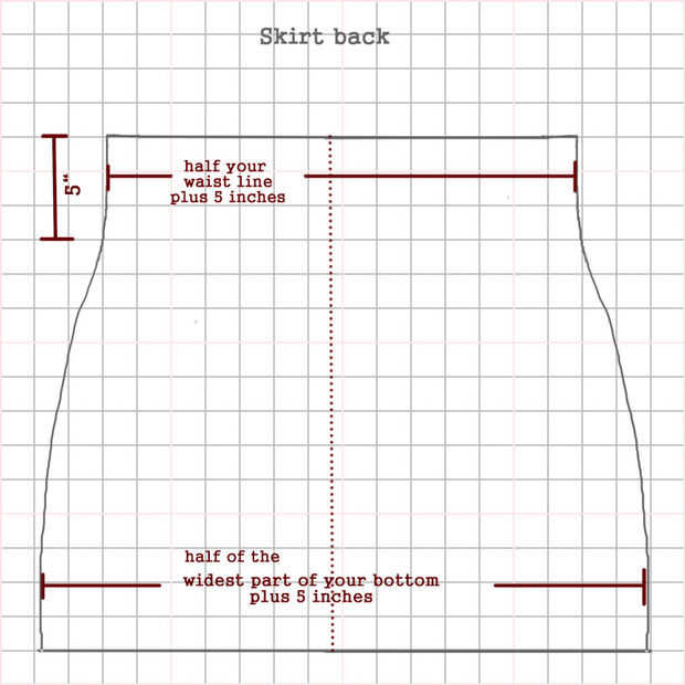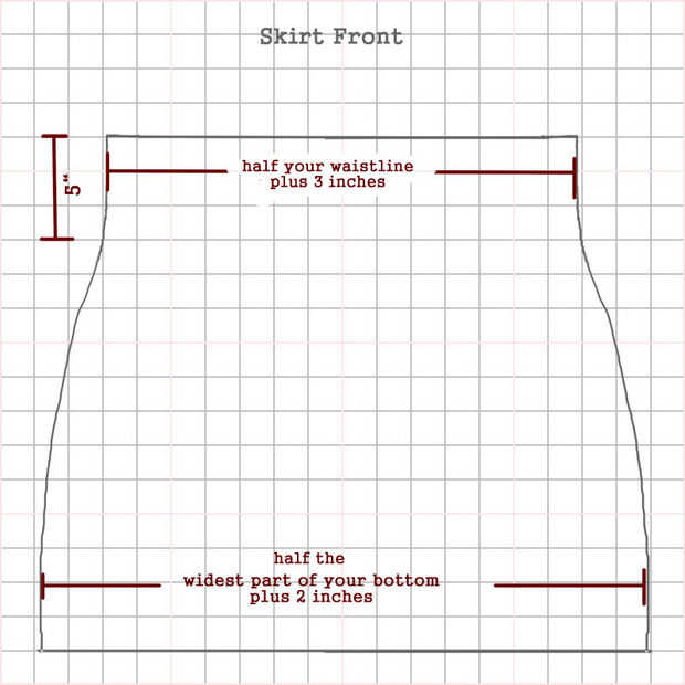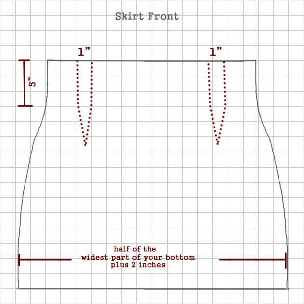 Frontal: La cintura medirá la mitad tu medida de cintura más 3 pulgadas. Le dará un margen de costura de 1/2" en cualquier lado y aproximadamente dos 1/2" dardos. La parte inferior de la falda en frente medirá medio su medición más 2 pulgadas más ancha.