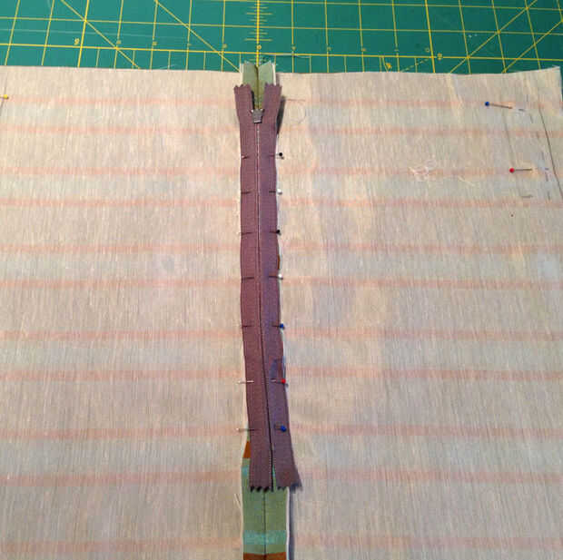 - Con el lado equivocado de la tela hacia arriba, el pin 9" zipper en la parte superior de la costura usted sólo cosido. La parte delantera de la cremallera debe ser cara abajo.