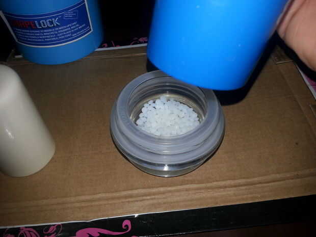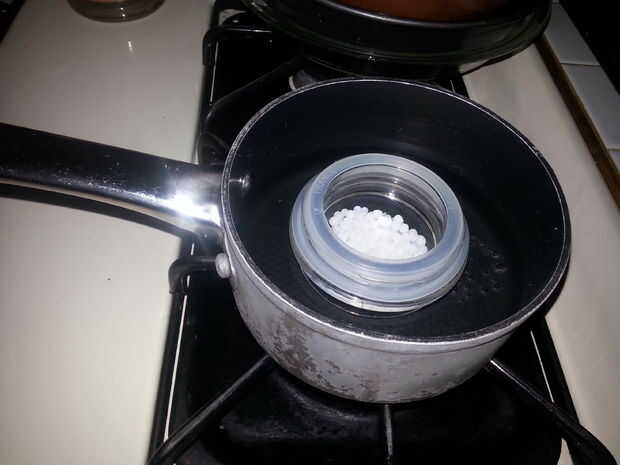 Tomar algunos Shapelock y calentar para arriba. Mi sugerencia es hacerlo en moda de baño María. Tarda más, pero es mucho más fácil controlar su temperatura. Me gusta usar la tapa de una vela del tarro para poner el Shapelock. La tapa no tiene problema con agua caliente, y la unidad entera puede ser eliminado del agua a su área de trabajo con un par de pinzas de una vez su lista. Use el termómetro para carnes para mantener un ojo sobre las temperaturas y una vez la Shapelock, utilice las pinzas para mover a su espacio de trabajo, luego use las pinzas para tirar Shapelock fuera de la tapa. N Put oun guante de seguridad para sujetar la tapa del primero. y tire la Shapelock con las tenazas hasta que salte hacia fuera.