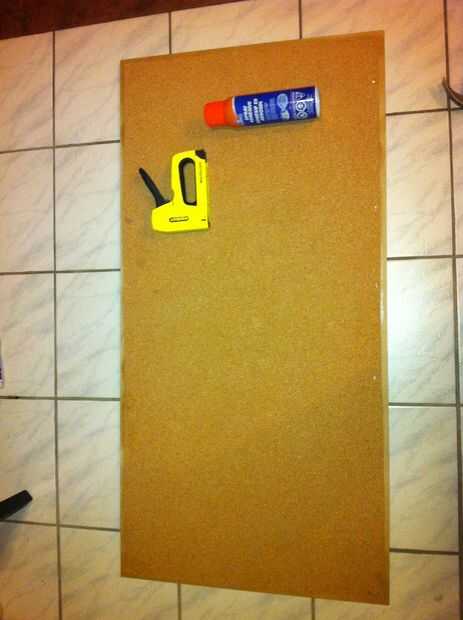 Mi primer intento de colocar el corcho a la madera sólo de rociado lo con el pegamento, poner algo pesado encima durante la noche y la esperanza de se quedaría... Realmente no funcionó, el corcho fue levantar en los bordes así que pegué otra vez pero esta vez pone grapas alrededor de los bordes para sujetar hacia abajo. Si hubiese comprado un pegamento más fuerte estoy seguro hubiera sido bien sin grapas, pero plan B trabajado gran.