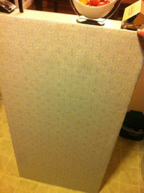 Elegir el patrón adecuado para la tela puede ser complicada. Recuerde que será cubierto en fotos y documentos por lo que no quiere destacar y llamar la atención, pero en su lugar proporciona un fondo bonito para lo que será la fijación. Fui con un ligero verde azulado y blanco para combinar con las paredes de su dormitorio y el marco. Quise encontrar un modelo de refrigerador pero colocado por éste ya que estaba en un apuro. Resultó gran tho y le encantó.