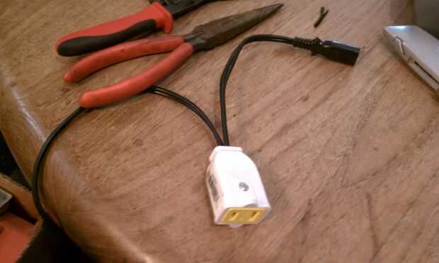 Comenzar por dividir el cable de alimentación suficientemente lejos del final que se enchufa (o es) el boombox para llegar a la zona donde va el cargador de teléfono que está escondido. Sólo se podría reducir allí como ling como conectar ambos extremos al conector hembra, pero no quiero que esto sea un punto débil donde podría sacar el cable.