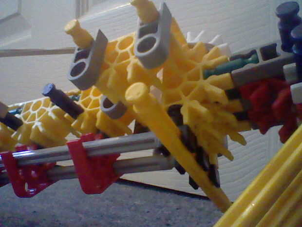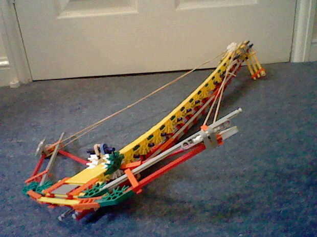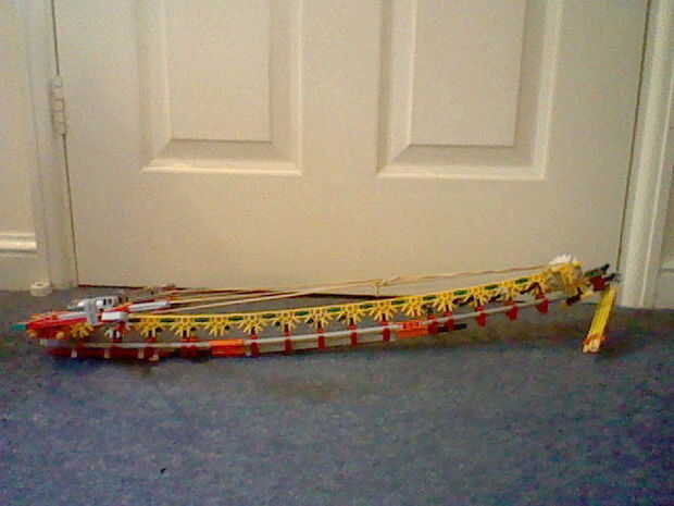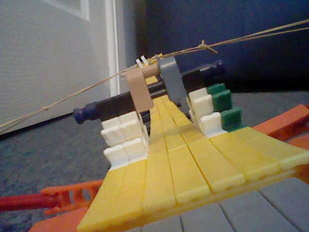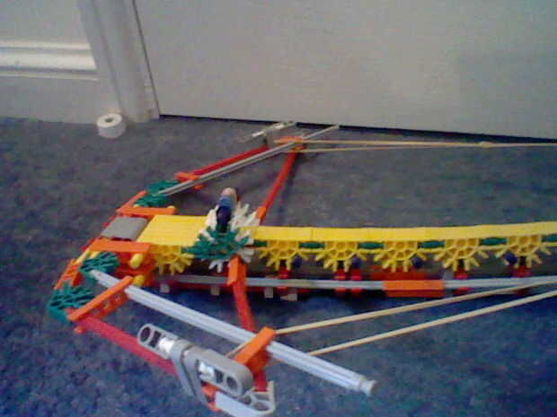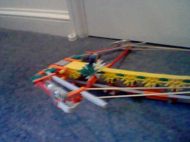 aquí es mi ballesta impresionante que construí. Me tomó una semana para llegar a este estado actual...Fácilmente puede disparar a través de cartón! Al principio, construí una versión más pequeña de esto pero su sistema de disparo no funcionaba, así q