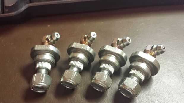 Las guarniciones de Alemite 3054-B son formadores de rosca y necesitan un agujero sin explotar de 0.230 a 0,235" de diámetro. El inyector de grasa está en ángulo a 90 grados para acceso en espacios reducidos como es necesario para las puertas en el coche. Ningún engrasador 90° funcionará pero quizás tenga que agregar un paso para el taladro por grifo. Éstos trabajaron slick.