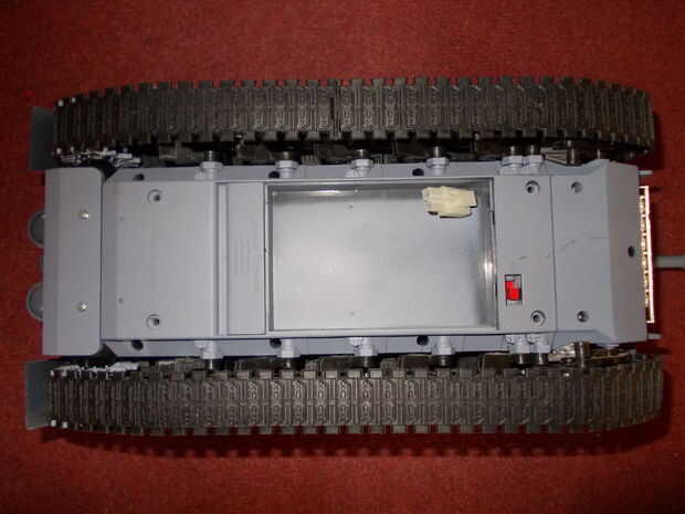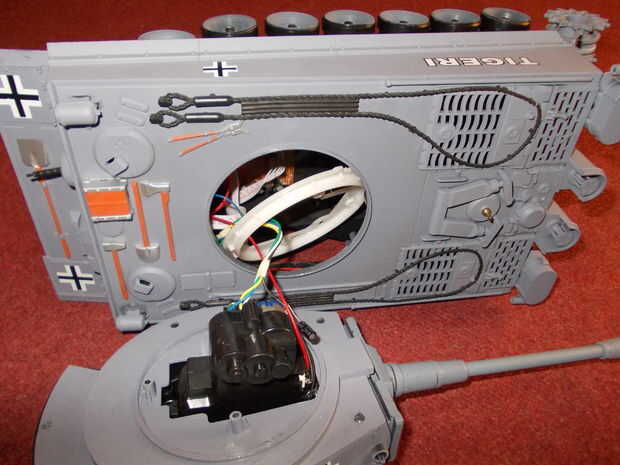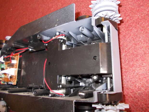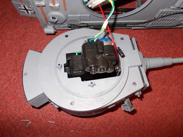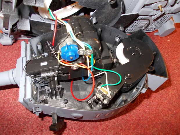 En la parte superior, se pueden ver un motor DC, algunos cables y un círculo blanco en forma de, que tiene engranajes en la parte exterior. Es el engranaje que da vuelta el casco superior. Cavar más profundo, sacar los tornillos que sostienen que la rueda blanca y saque el casco.