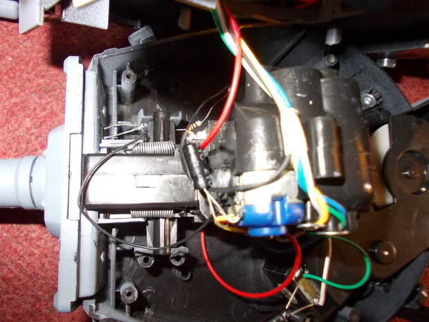 No verá mucho, solo el casco y el mecanismo de disparo fuera. Hay cinco tornillos que cubre el resto, toma hacia fuera y echar un vistazo en el interior. Se puede ver el LED que se ilumina al disparar, el resto del mecanismo de disparo, el mecanismo de elevación del cañón y algunos switches con cables.