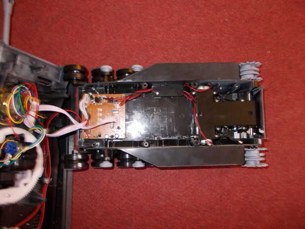 A primera vista, verá un ~ 2 x 2 pulgadas junta con algunos transistores, resistores, condensadores en él. Es el receptor de RF y la sección de controlador de los motores. En la parte delantera, verá la caja de cambios recubierto de plástico, sujeta los engranajes en su lugar.