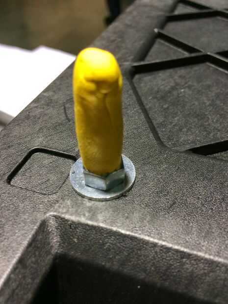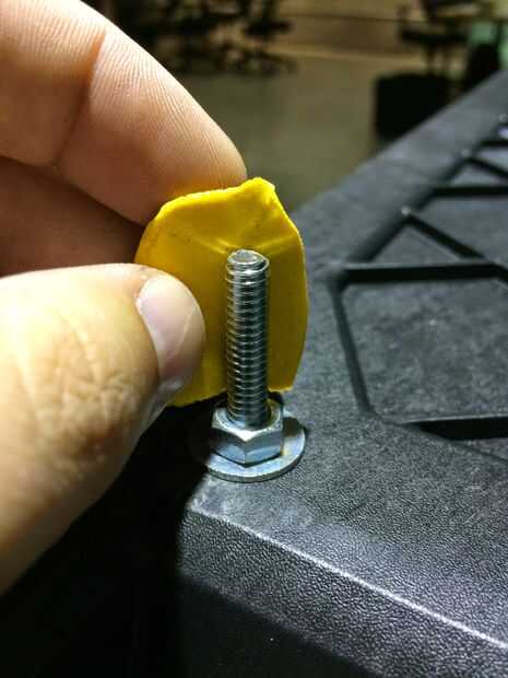 Usé la mitad de un mini-pack de Sugru para cada tornillo. Amasar el Sugru para exponerlo al aire y que se active. Aplanar la Sugru por lo que es un poco más alto que el perno. Envuelva el Sugru alrededor del perno y doblar la parte superior. Sugru tiene un tiempo de trabajo de 30 minutos por lo que podrás bajar todos los pernos dentro de ese tiempo. Esto es importante porque he encontrado útil para colocar la caja de herramientas derecha hacia arriba y colóquelo hacia abajo sobre la mesa. No quieres forzar hacia abajo pero el peso de la caja de herramientas vacía debe ser fino. Esto aplanar la Sugru en el extremo de los pernos y asegurarse de que son todos la misma altura para que no tenga una caja de herramientas tambaleante cuando se coloque sobre una mesa de trabajo. Luego debe voltear el cuadro de herramientas al revés otra vez y dejarlo durante 24 horas para el Sugru curar completamente.