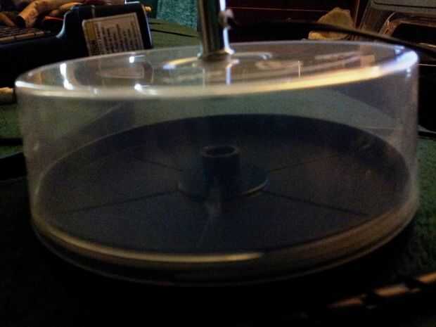 En primer lugar, sería necesario una nueva base. Estar involucrado en la industria de los medios de comunicación, tenía unos 50 pack CD/DVD cajas vacías ahí, que parecía una buena opción para hacer una nueva base. Me sacó unas brocas de diferentes tamaños y comencé a taladrar un agujero en la parte superior, parte central de la caja hasta que era sólo lo suficientemente grande como para que el brazo. Lo hice para que, cuando montado el brazo que ya estaba ensartado, sería un ajuste perfecto. Yo estaba haciendo esto, me di cuenta del eje que los medios del disco de antes necesita cortarse para que el brazo podría encajar correctamente. Una vez que el agujero fue lo suficientemente grande para el brazo de ajuste, jodido el brazo en su lugar, aprovechando la rosca.
