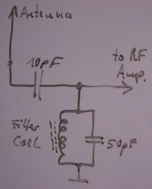 Mirando el artículo de Wikipeda encontrará un cuadro debajo de "Diseño y su evolución". El bloque llamado "Amplificador RF" es el lugar donde se encuentra el primer filtro, diseñado con una bobina y un condensador. El segundo filtro, el resonador está marcado con "Filtro".