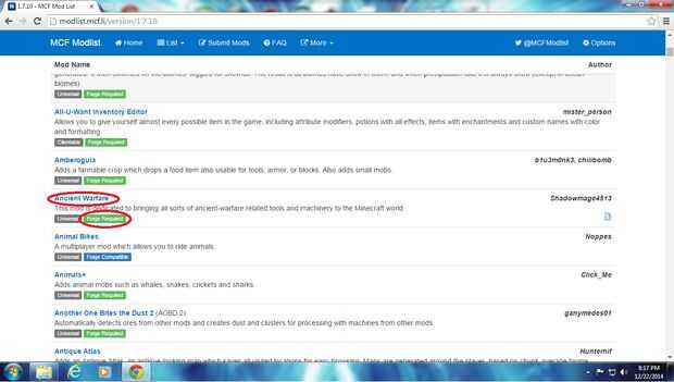 Abrir una nueva pestaña e ir a modlist.mcf.li/version/1.7.10 (poner tu versión Dónde está el 1.7.10). Mirar a través de la lista y elija una que suena bien a usted. (Yo escogí la antigua guerra). Entonces simplemente comprobar si dice 'forge compatibles' o 'requiere forjar', si lo hace, entonces termine y sólo tienes que hacer clic en él.