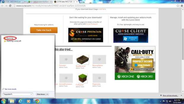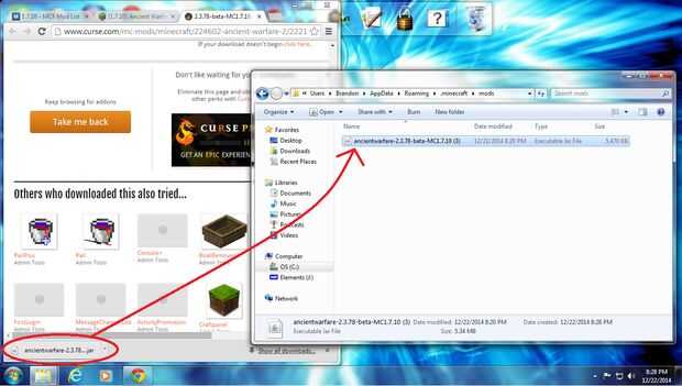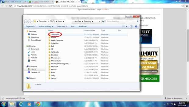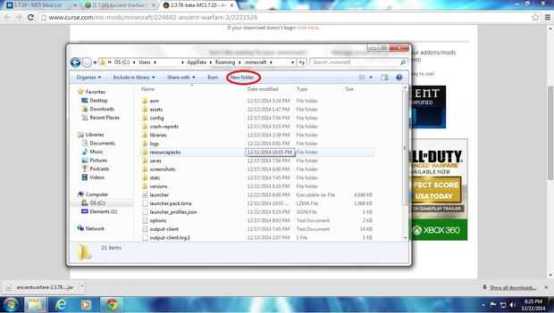 Haga clic en el icono de windows. Escriba % appdata % en la barra de búsqueda y haga clic en ' roaming '. Abrir el archivo .minecraft y haga clic en Nueva carpeta. Nombre de los mods de carpeta nueva. Abra la carpeta de mods, luego abre tu navegador, abajo en la parte inferior es el mod que descargaste, haga clic y arrastre hasta la carpeta de mods.