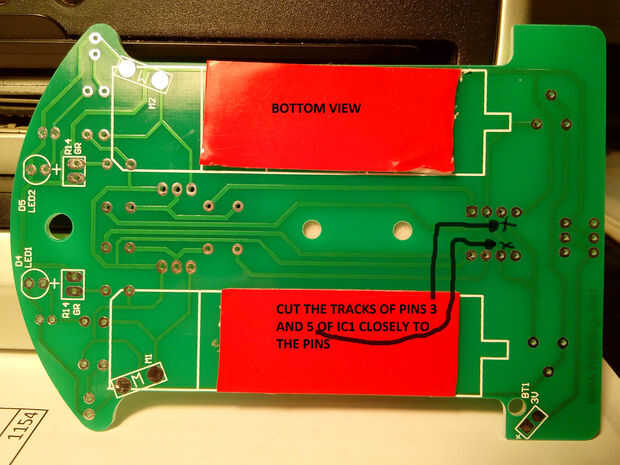 - En la parte inferior del circuito impreso de corte lateral las pistas cerca de 3 pines y 5 de IC1 (como se puede ver en la imagen de arriba).
