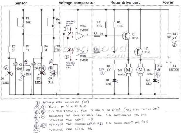 - Desoldar el fotoresistor R13 y cortocircuito sus pernos (vea el esquema modificado).